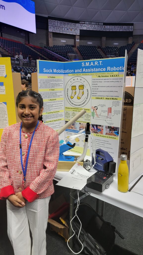 Raji’s invention, SMART—Sock Mobilization and Assistance Robotic Technology—makes wearing compression socks easier for seniors and individuals with limited mobility. Inspired by her grandmother’s struggles with arthritis, Raji designed a device that allows users to place their foot in a sock, press a button, and have the sock pulled up automatically via a conveyor belt mechanism.